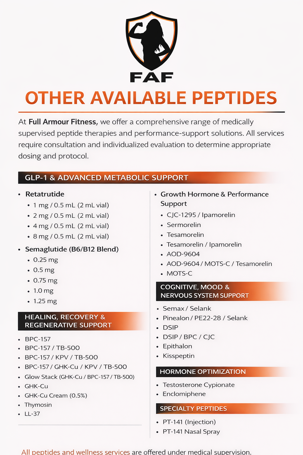 Full Armour Fitness is not a medical provider and does not diagnose, treat, or prescribe medical conditions. Full Armour Fitness acts as a care coordinator that facilitates access to a network of licensed medical providers. All medical evaluations, diagnoses, prescriptions, and treatment plans—including peptide therapy, medical weight loss, and HRT/TRT—are provided and managed solely by licensed medical professionals.